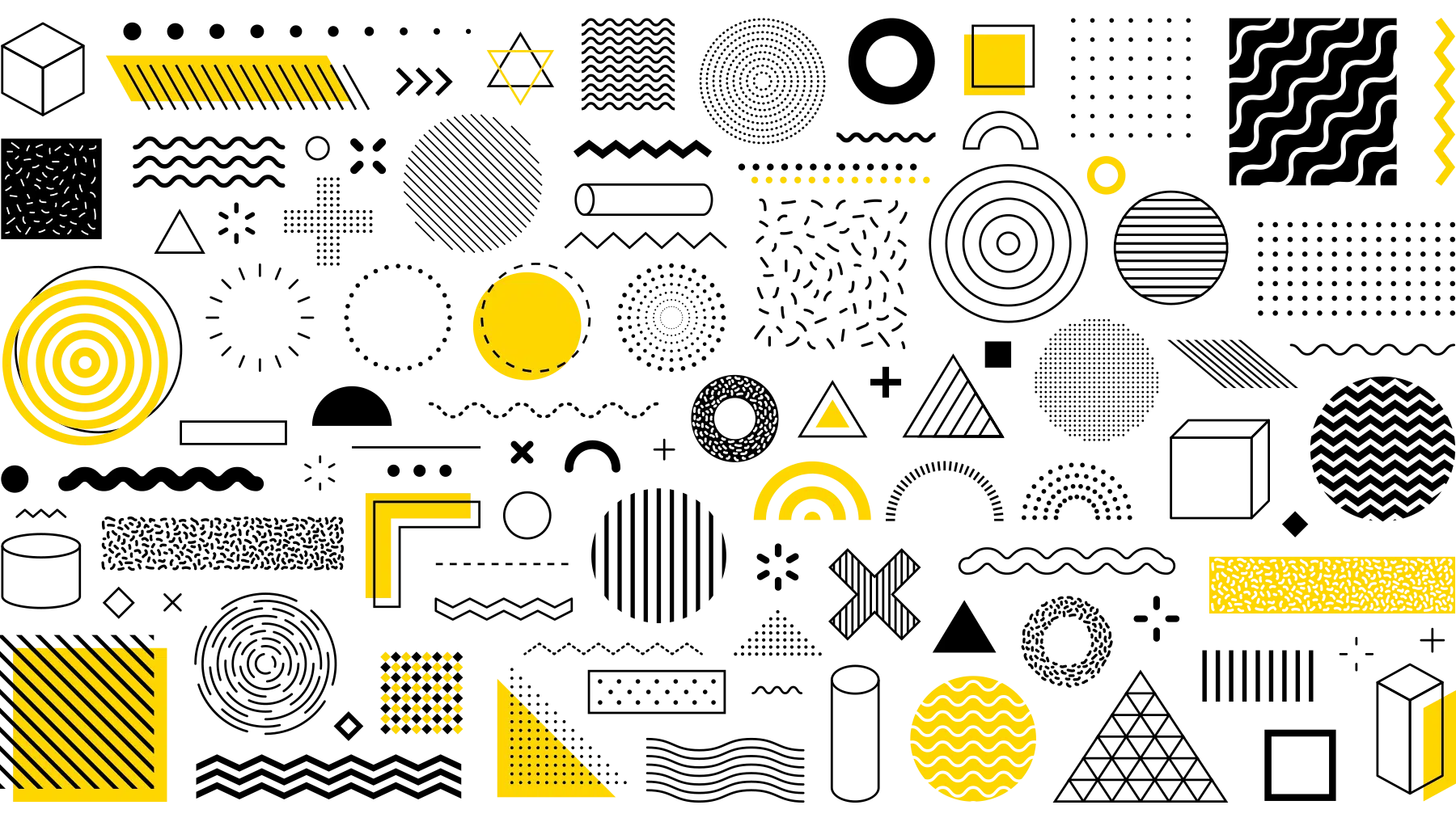 Abstraktes, modernes Hintergrundmuster aus gelben und grauen geometrischen Formen auf schwarzem Grund. Das Design zeigt verschiedene gestreifte, gepunktete und solide Elemente wie Kreise, Dreiecke, Quadrate, Linien und wellenförmige Muster in einem dynamischen, verstreuten Layout.